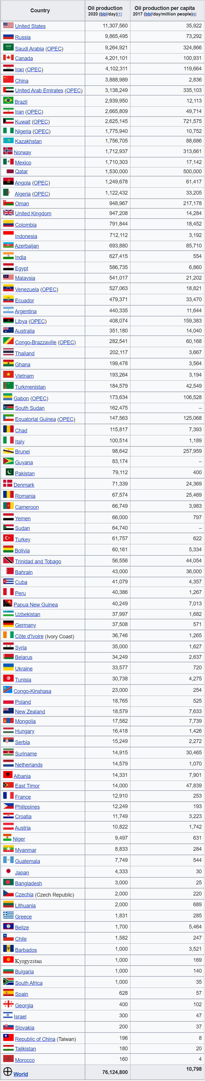 Under this definition, total world oil production in 2020 averaged 76,124,800 barrels per day. Approximately 71% came from the top ten countries, and an overlapping 36% came from the thirteen current OPEC members, in the table below.